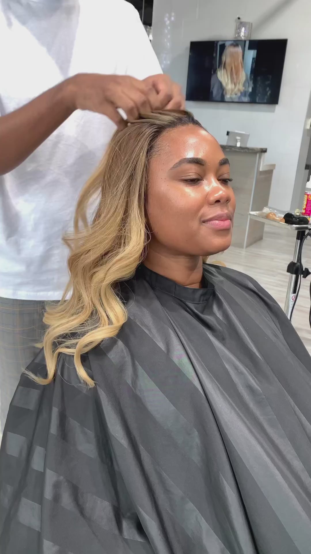 Highlighted and color melted blonde 24” glueless 5x5 lace closure wig styled bone straight. 200% density top quality virgin hair